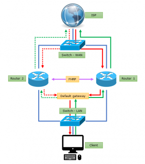 A megoldás valamely FHRP[4] protokoll, amit arra fejlesztettek ki, hogy két eszköz eldöntse éppen melyik használjon egy közös IP címet. Ha az egyik kiesik, a másik automatikusan felveszi azt, és folytatja a munkát vele.
