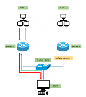 Az alapértelmezett átjáró mellett az operációs rendszereken lehetőség van statikus route-ok felvételére. A pédában az 1. router az alapértelmezett átjáró, a 2. router felé pedig statikus route-ot veszünk fel. Így a tárgyi host tudni fogja, hogy bizonyos hálózatok felé más irányba kell küldeni a csomagokat, mint az alapértelmezett átjáró.